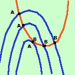Consideriamo 2 curve, una rossa ed una blu che si intersechino in 2 punti A e Bspostiamo ora la curva blu in modo che i due punti di intersezione A e B si avvicinino fra loro. Quando le due curve diventano tangenti i due punti A e B si fondono in un unico punto che si dice punto doppio (oppure si dice anche che le due curve hanno un contatto del secondo ordine) |