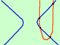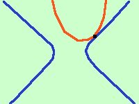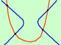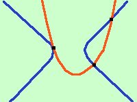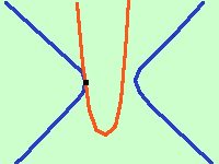 Disegnare le possibili intersezioni fra un'iperbole in forma canonica ed una parabola con asse verticale Distinguiamo nelle figure se le intersezioni reali sono fra la parabola e un solo ramo dell'iperbole oppure fra la parabola ed entrambe i rami dell'iperbole. Fissato questo passiamo a vedere quali sono le possibili soluzioni
